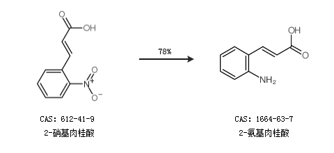 1.通过2-硝基肉桂酸合成2-氨基肉桂酸,收率约78%;