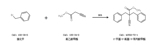1.通过溴化苄和氰乙酸甲酯合成2-苄基-2-氰基-3-苯丙酸甲酯,收率约96%;