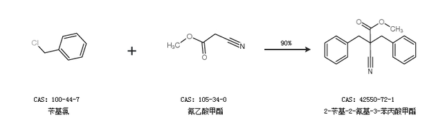 2.通过苄基氯和氰乙酸甲酯合成2-苄基-2-氰基-3-苯丙酸甲酯,收率约90%;