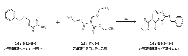 1.通过3-苄磺酰基-1H-1,2,4-噻唑-5-胺和乙氧基甲叉丙二酸二乙酯合成2-苄基磺酰基-7-羟基-[1,2,4]噻唑并[1,5-a]嘧啶-6-羧酸乙酯,收率约64%;