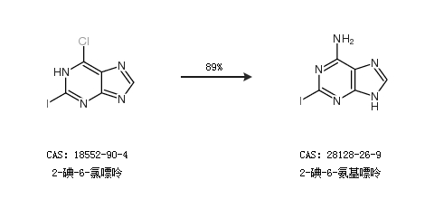 1.通过2-碘-6-氯嘌呤合成2-碘-6-氨基嘌呤,收率约89%;