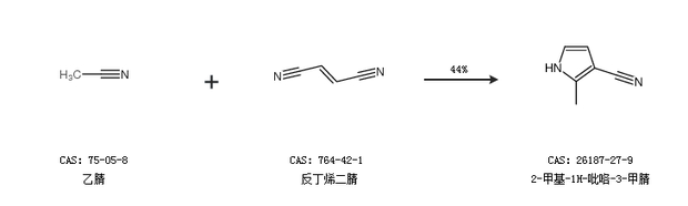 1.通过乙腈和反丁烯二腈合成2-甲基-1H-吡咯-3-甲腈,收率约44%;