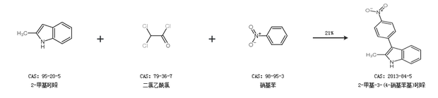 2.通过2-甲基吲哚、二氯乙酰氯和硝基苯合成2-甲基-3-(4-硝基苯基)吲哚,收率约21%;