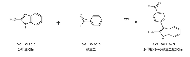 1.通过2-甲基吲哚和硝基苯合成2-甲基-3-(4-硝基苯基)吲哚,收率约21%;