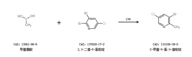 1.通过甲基硼酸和2,3-二溴-5-氯吡啶合成2-甲基-5-氯-3-溴吡啶,收率约13%;