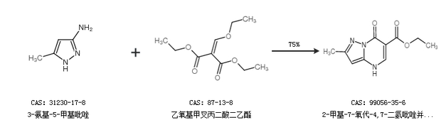 1.通过3-氨基-5-甲基吡唑和乙氧基甲叉丙二酸二乙酯合成2-甲基-7-氧代-4,7-二氢吡唑并[1,5-a]嘧啶-6-羧酸乙酯,收率约75%;