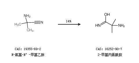 2.通过N-氰基-N’-甲基乙脒合成2-甲基丙氨酰胺,收率约14%;