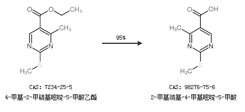 1.通过4-甲基-2-甲硫基嘧啶-5-甲酸乙酯合成2-甲基巯基-4-甲基嘧啶-5-甲酸,收率约95%;