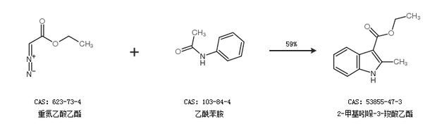 1.通过重氮乙酸乙酯和乙酰苯胺合成2-甲基吲哚-3-羧酸乙酯,收率约59%;