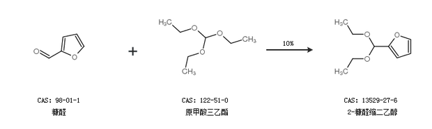 1.通过糠醛和原甲酸三乙酯合成2-糠醛缩二乙醇,收率约10%;