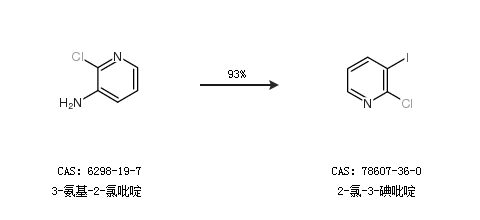 1.通过3-氨基-2-氯吡啶合成2-氯-3-碘吡啶,收率约93%;