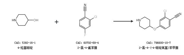 1.通过4-羟基哌啶和2-氯-4-氟苯腈合成2-氯-4-(-4-哌啶氧基)苯甲腈