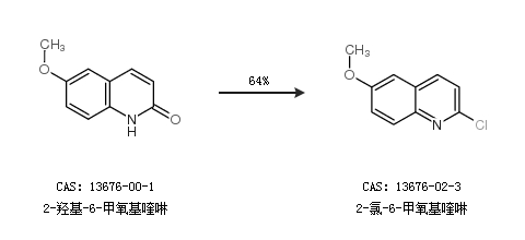 1.通过2-羟基-6-甲氧基喹啉合成2-氯-6-甲氧基喹啉,收率约64%;