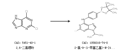 2.通过2,6-二氯嘌呤合成2-氯-9-(1-甲基乙基)-N-[4-(4,4,5,5-四甲基-1,3,2-二噁硼烷-2-基)苯基]-9H-嘌呤-6-胺