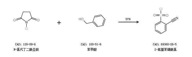 2.通过N-氯代丁二酰亚胺和苯甲醇合成2-氰基苯磺酰氯,收率约57%;