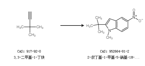 1.通过3,3-二甲基-1-丁炔合成2-叔丁基-1-甲基-5-硝基-1H-吲哚