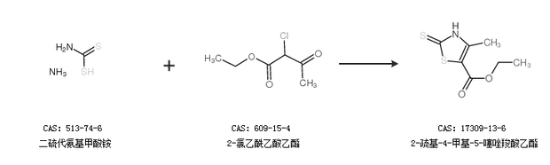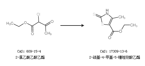2.通过2-氯乙酰乙酸乙酯合成2-疏基-4-甲基-5-噻唑羧酸乙酯