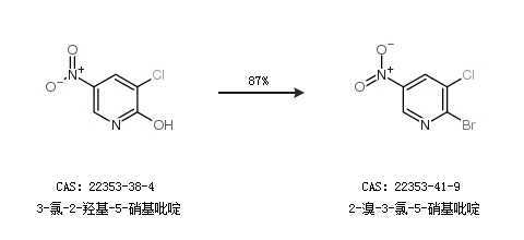 1.通过3-氯-2-羟基-5-硝基吡啶合成2-溴-3-氯-5-硝基吡啶,收率约87%;