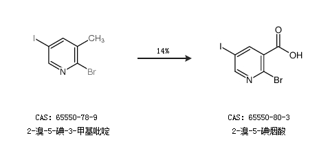 1.通过2-溴-5-碘-3-甲基吡啶合成2-溴-5-碘烟酸,收率约14%;