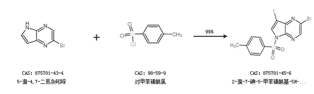 2.通过5-溴-4,7-二氮杂吲哚和对甲苯磺酰氯合成2-溴-7-碘-5-甲苯磺酰基-5H-吡咯并[2,3-B]吡嗪,收率约99%;