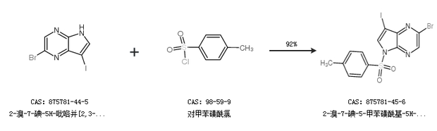 1.通过2-溴-7-碘-5H-吡咯并[2,3-B]吡嗪和对甲苯磺酰氯合成2-溴-7-碘-5-甲苯磺酰基-5H-吡咯并[2,3-B]吡嗪,收率约92%;