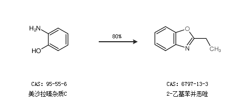 1.通过美沙拉嗪杂质C合成2-乙基苯并恶唑,收率约10%;