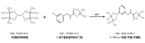 1.通过联硼酸频那醇酯和3-溴苄基氨基甲酸叔丁酯合成3-((N-boc-氨基)甲基)苯硼酸,收率约86%;
