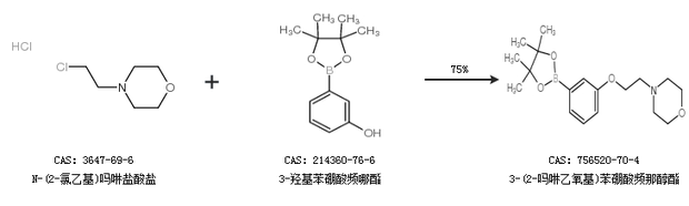 1.通过N-(2-氯乙基)吗啉盐酸盐和3-羟基苯硼酸频哪酯合成3-(2-吗啉乙氧基)苯硼酸频那醇酯,收率约75%;