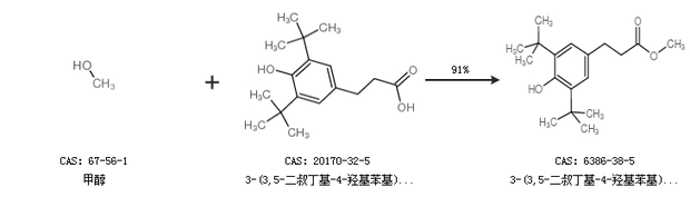 1.通过甲醇和3-(3,5-二叔丁基-4-羟基苯基)丙酸合成3-(3,5-二叔丁基-4-羟基苯基)丙酸甲酯,收率约91%;