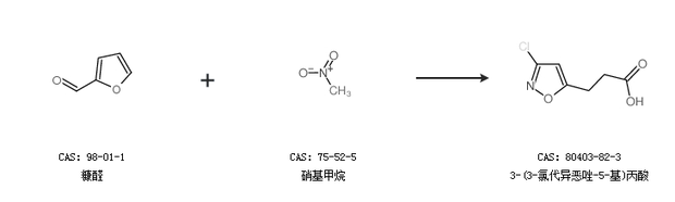 1.通过糠醛和硝基甲烷合成3-(3-氯代异恶唑-5-基)丙酸