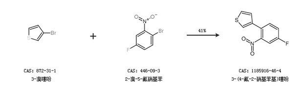 1.通过3-溴噻吩和2-溴-5-氟硝基苯合成3-(4-氟-2-硝基苯基)噻吩,收率约41%;