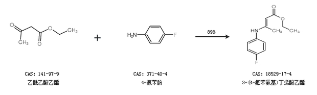 1.通过乙酰乙酸乙酯和4-氟苯胺合成3-(4-氟苯氨基)丁烯酸乙酯,收率约89%;