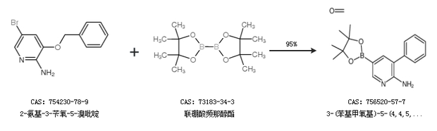 1.通过2-氨基-3-苄氧-5-溴吡啶和联硼酸频那醇酯合成3-(苯基甲氧基)-5-(4,4,5,5-四甲基-1,3,2-二噁硼烷-2-基)-2-吡啶胺,收率约95%;