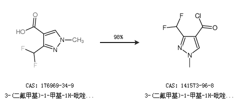 1.通过3-(二氟甲基)-1-甲基-1H-吡唑-4-羧酸合成3-(二氟甲基)-1-甲基-1H-吡唑-4-羰酰氯,收率约98%;