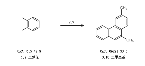 1.通过1,2-二碘苯合成3,10-二甲基菲,收率约25%;