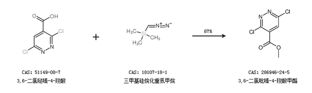 2.通过3,6-二氯哒嗪-4-羧酸和三甲基硅烷化重氮甲烷合成3,6-二氯吡嗪-4-羧酸甲酯,收率约87%;