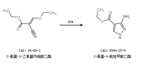 1.通过2-氰基-3-乙氧基丙烯酸乙酯合成3-氨基-4-吡唑甲酸乙酯,收率约93%;