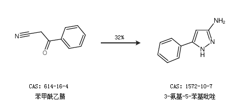 1.通过苯甲酰乙腈合成3-氨基-5-苯基吡唑,收率约32%;