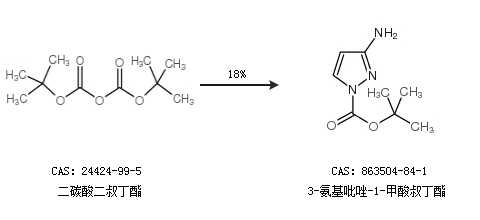 1.通过二碳酸二叔丁酯合成3-氨基吡唑-1-甲酸叔丁酯,收率约18%;