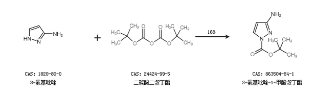 2.通过3-氨基吡唑和二碳酸二叔丁酯合成3-氨基吡唑-1-甲酸叔丁酯,收率约16%;