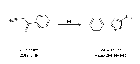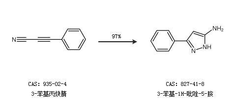 2.通过3-苯基丙炔腈合成3-苯基-1H-吡唑-5-胺,收率约97%;