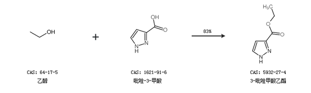 2.通过乙醇和吡唑-3-甲酸合成3-吡唑甲酸乙酯,收率约83%;