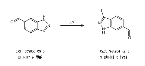 1.通过1H-吲唑-6-甲醛合成3-碘吲唑-6-羧醛,收率约80%;