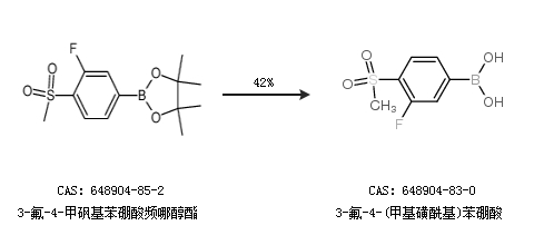 1.通过3-氟-4-甲砜基苯硼酸频哪醇酯合成3-氟-4-(甲基磺酰基)苯硼酸,收率约42%;