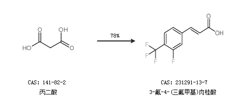 1.通过丙二酸合成3-氟-4-(三氟甲基)肉桂酸,收率约78%;