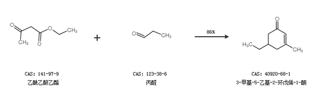1.通过乙酰乙酸乙酯和丙醛合成3-甲基-5-乙基-2-环戊烯-1-酮,收率约86%;