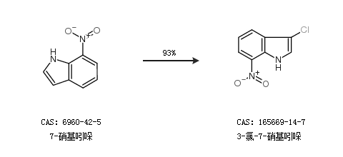 1.通过7-硝基吲哚合成3-氯-7-硝基吲哚,收率约93%;