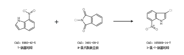 2.通过7-硝基吲哚和N-氯代酞酰亚胺合成3-氯-7-硝基吲哚