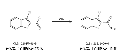 1.通过3-氯苯并ób]噻酚-2-羰酰氯合成3-氯苯并[b]噻吩-2-甲酰胺,收率约79%;