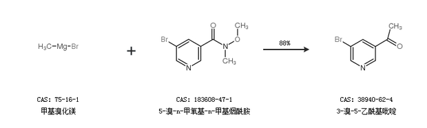 1.通过甲基溴化镁和5-溴-n-甲氧基-n-甲基烟酰胺合成3-溴-5-乙酰基吡啶,收率约88%;
